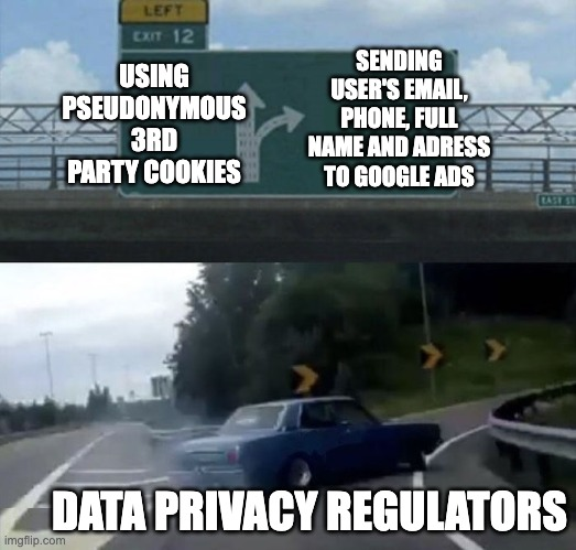 Uživatelská data vznikají na frontendu nebo v CRM a mediální systémy jde “krmit” jak přímo z webu, tam importem z CRM (například už s nějakou CRM segmentací). Pojďme se nyní věnovat datům, které vznikají na frontendu webu, když uživatel interaguje s webem či aplikací - například když vyplní kontaktní formulář, zaregistruje se nebo nakoupí. Tato data potřebujete jako provozovatel nějaké služby nebo internetového obchodu k tomu, abyste mohli uživateli svou službu poskytnout. To vám ale samozřejmě nedává automatické právo na odeslání tohoto e-mailu třetí straně, čímž posílání rozšířených konverzí do Google Ads rozhodně je.